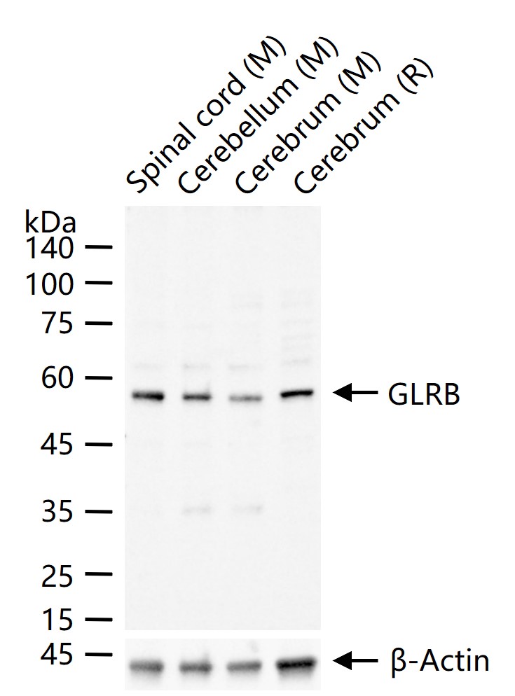 25 ug total protein per lane of various lysates (see on figure) probed with GLRB polyclonal antibody, unconjugated (bs-20450R) at 1:1000 dilution and 4°C overnight incubation. Followed by conjugated secondary antibody incubation at r.t. for 60 min.