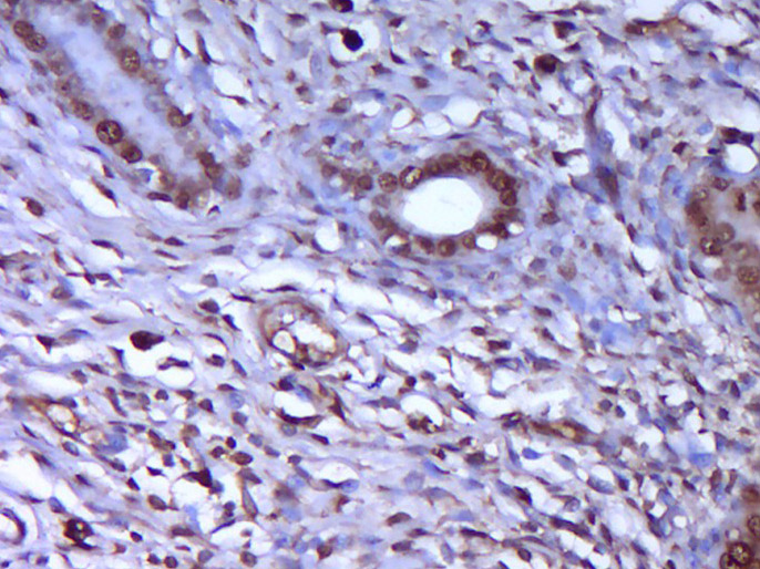 Paraformaldehyde-fixed, paraffin embedded (Rat uterus); Antigen retrieval by boiling in sodium citrate buffer (pH6.0) for 15min; Block endogenous peroxidase by 3% hydrogen peroxide for 20 minutes; Blocking buffer (normal goat serum) at 37°C for 30min; Antibody incubation with (HSP27) Polyclonal Antibody, Unconjugated (bs-20666R) at 1:400 overnight at 4°C, followed by operating according to SP Kit(Rabbit) (sp-0023) instructionsand DAB staining.