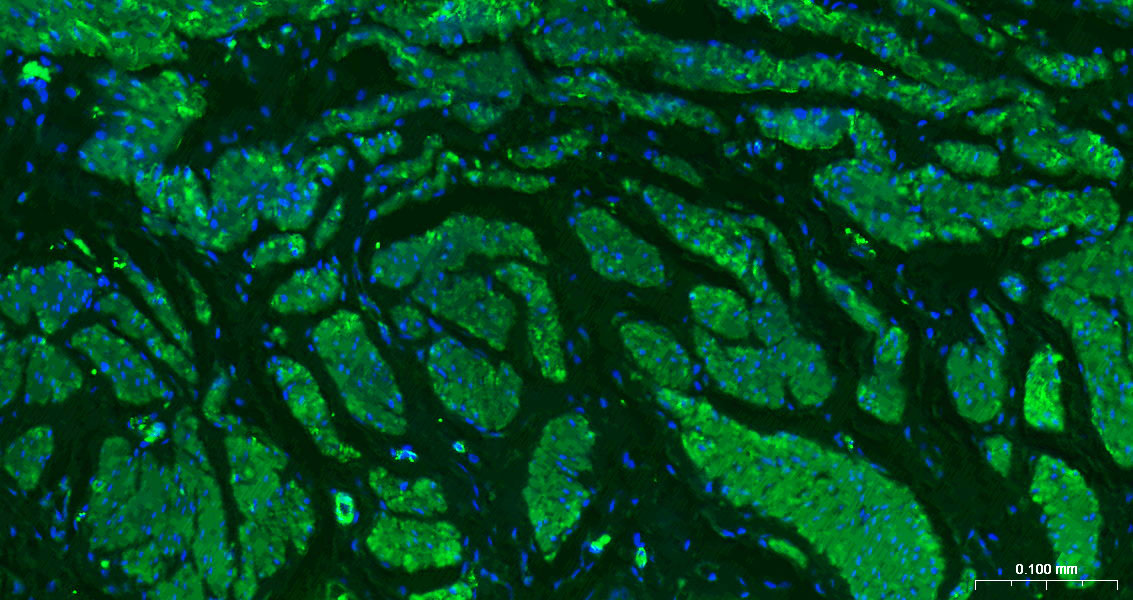 Paraformaldehyde-fixed, paraffin embedded Human Uterus; Antigen retrieval by boiling in sodium citrate buffer (pH6.0) for 15 min; The section was incubated with Desmin Monoclonal Antibody, Unconjugated (bsm-33229M) at 1:200 overnight at 4°C. Followed by conjugated Goat Anti-Mouse IgG antibody (green, bs-0296G-BF488), DAPI (blue, C02-04002) was used to stain the cell nuclei.