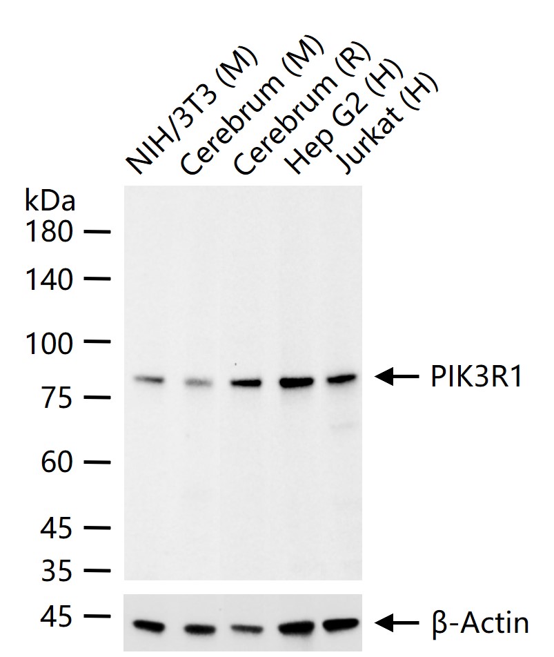 25 ug total protein per lane of various lysates (see on figure) probed with PIK3R1 monoclonal antibody, unconjugated (bsm-33219M) at 1:1000 dilution and 4°C overnight incubation. Followed by conjugated secondary antibody incubation at r.t. for 60 min.