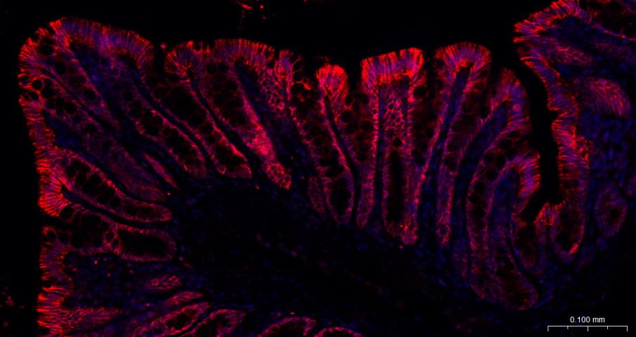 Paraformaldehyde-fixed, paraffin embedded (mouse colon); Antigen retrieval by boiling in sodium citrate buffer (pH6.0) for 15min; Blocking buffer (normal goat serum) at 37°C for 30min; Incubation with (ATP1A1) Polyclonal Antibody, Unconjugated (bs-42166R) at 1:200 overnight at 4°C, followed by a conjugated Goat Anti-Rabbit IgG antibody (bs-0295G-BF594) for 90 minutes, and DAPI for nuclei staining.