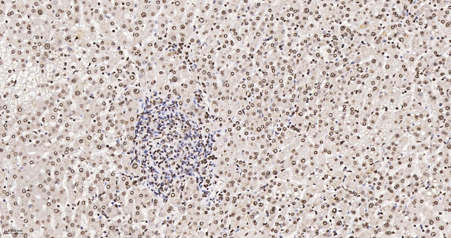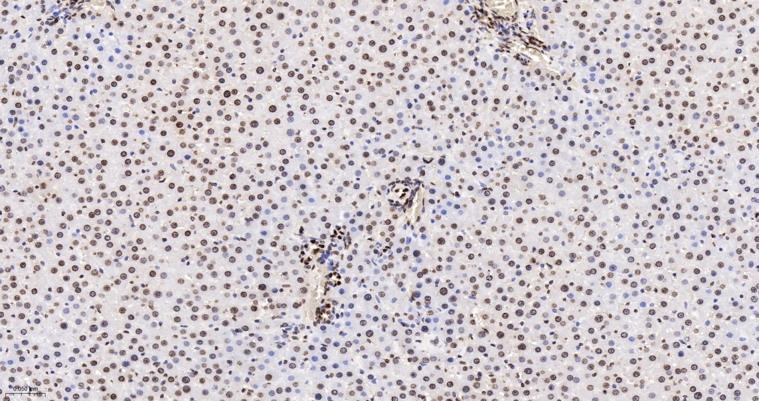 Paraformaldehyde-fixed, paraffin embedded Rat Liver; Antigen retrieval by boiling in sodium citrate buffer (pH6.0) for 15 min; The section was incubated with Histone H3(mono methyl K79) Monoclonal Antibody, Unconjugated (ascites of bsm-33104M) at 1:1500 overnight at 4°C, followed by conjugation to the bs-40296G-HRP and DAB (C-0010) staining.