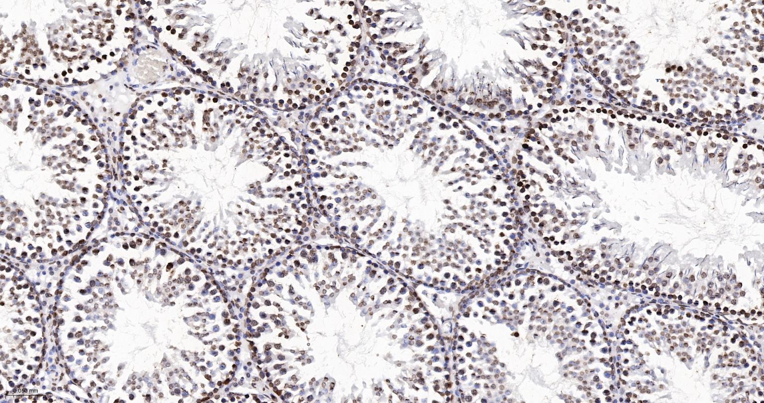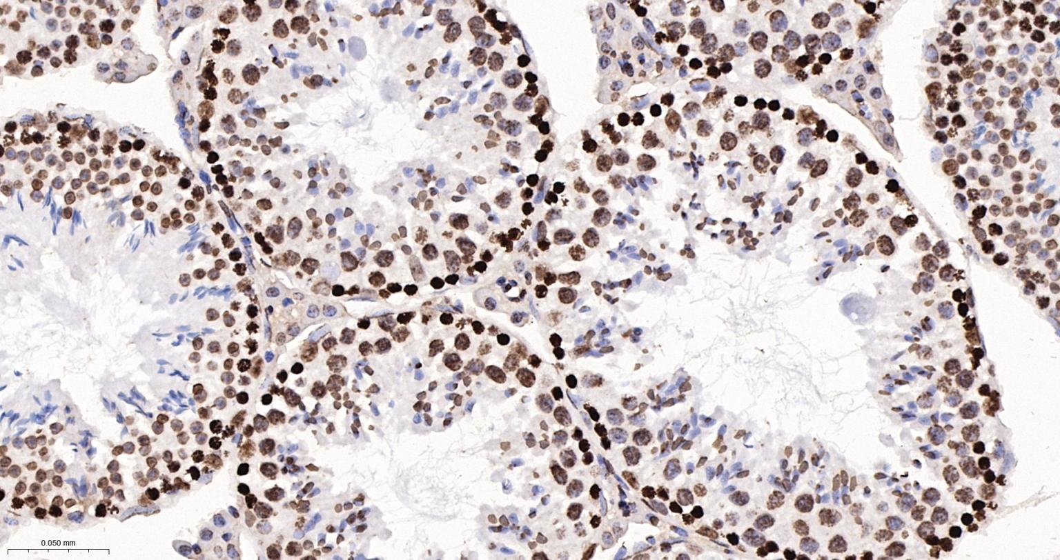 Paraformaldehyde-fixed, paraffin embedded Rat Testicles; Antigen retrieval by boiling in sodium citrate buffer (pH6.0) for 15 min; The section was incubated with Histone H3(mono methyl K79) Monoclonal Antibody, Unconjugated (ascites of bsm-33104M) at 1:1500 overnight at 4°C, followed by conjugation to the bs-40296G-HRP and DAB (C-0010) staining.