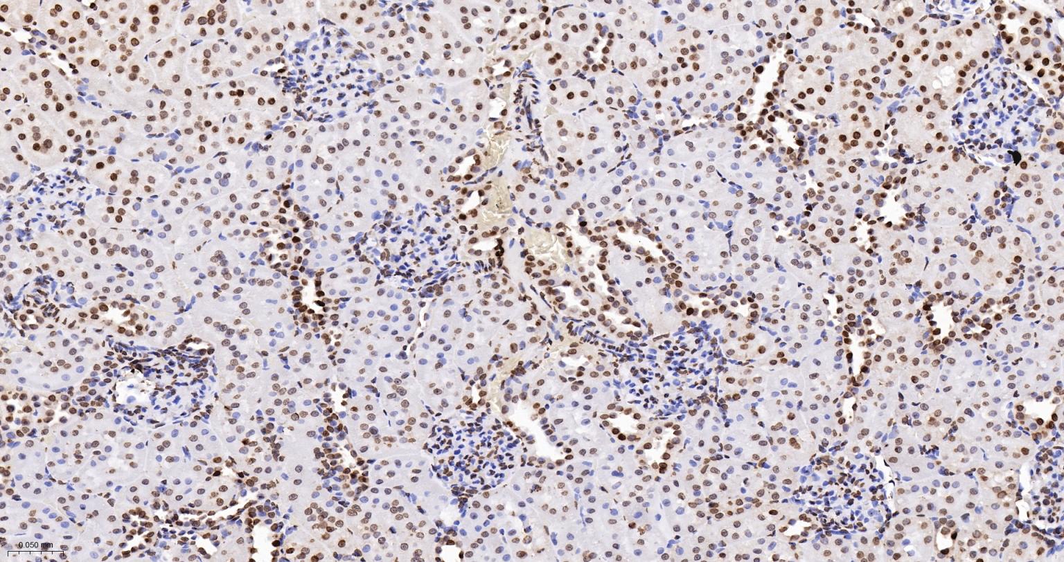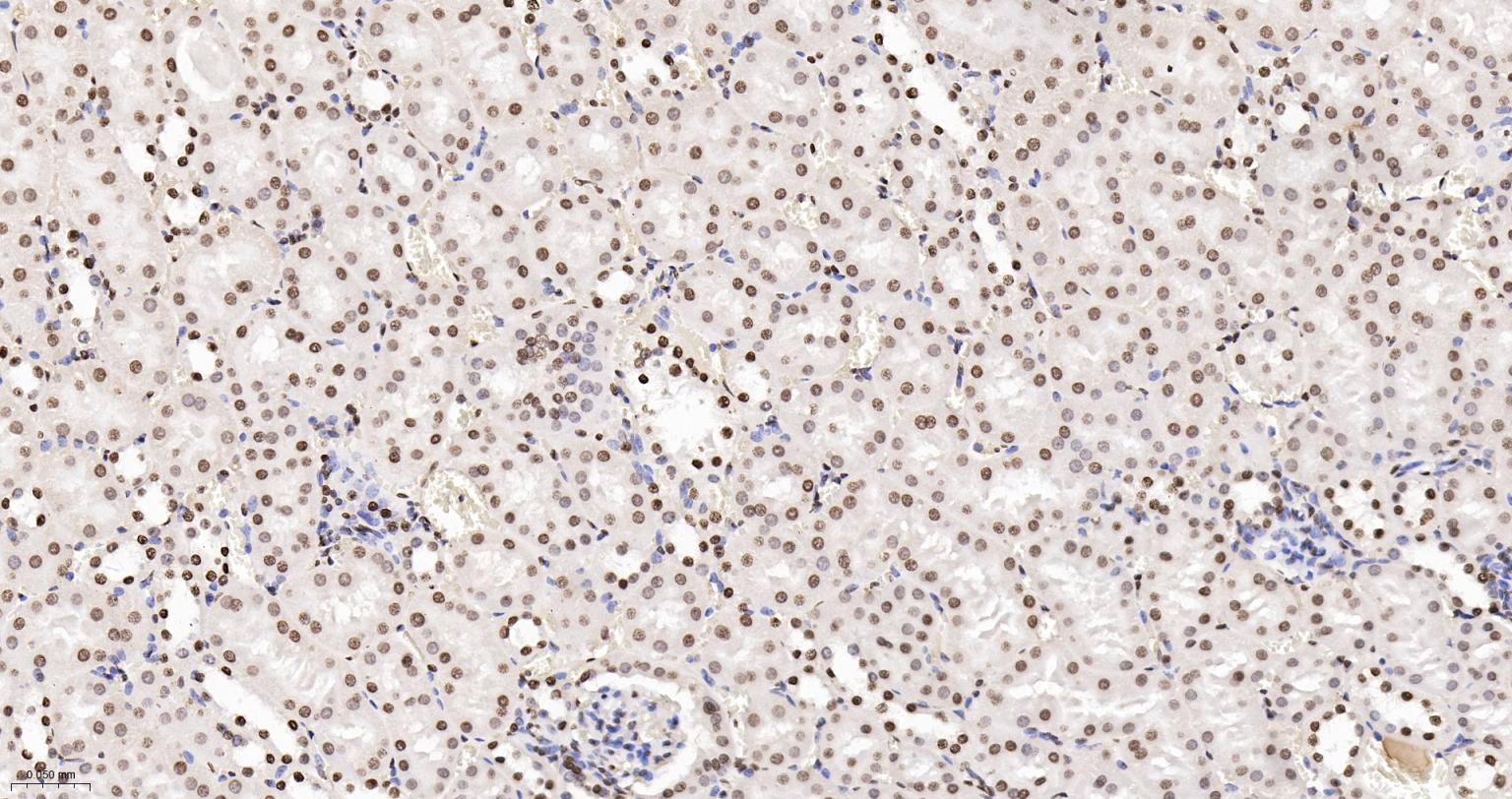 Paraformaldehyde-fixed, paraffin embedded Rat Kidney; Antigen retrieval by boiling in sodium citrate buffer (pH6.0) for 15 min; The section was incubated with Histone H3(mono methyl K79) Monoclonal Antibody, Unconjugated (ascites of bsm-33104M) at 1:1500 overnight at 4°C, followed by conjugation to the bs-40296G-HRP and DAB (C-0010) staining.