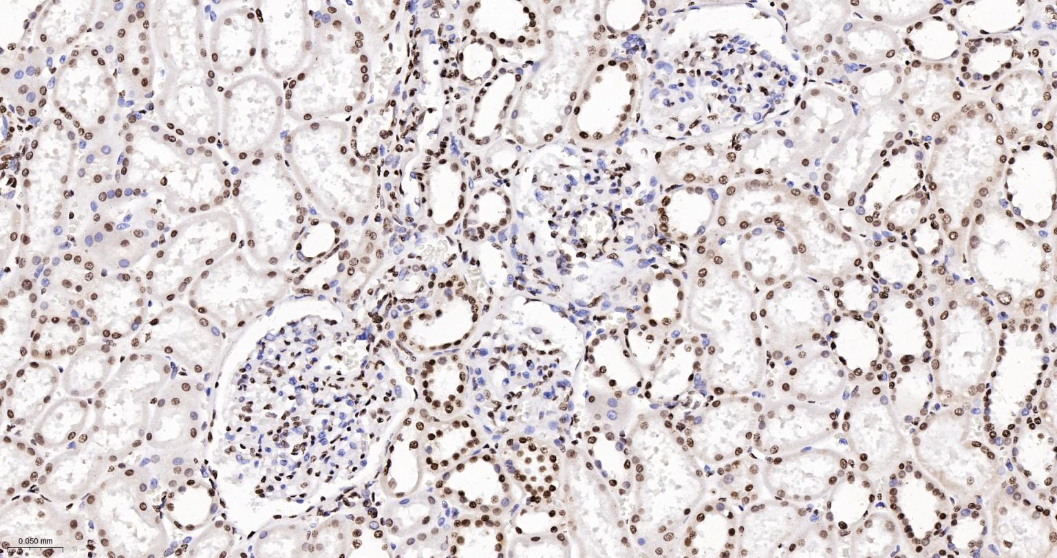 Paraformaldehyde-fixed, paraffin embedded Human Kidney; Antigen retrieval by boiling in sodium citrate buffer (pH6.0) for 15 min; The section was incubated with Histone H3(mono methyl K79) Monoclonal Antibody, Unconjugated (ascites of bsm-33104M) at 1:1500 overnight at 4°C, followed by conjugation to the bs-40296G-HRP and DAB (C-0010) staining.