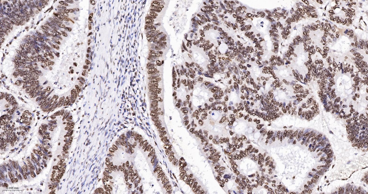 Paraformaldehyde-fixed, paraffin embedded Human Colon Cancer; Antigen retrieval by boiling in sodium citrate buffer (pH6.0) for 15 min; The section was incubated with Histone H3(mono methyl K79) Monoclonal Antibody, Unconjugated (ascites of bsm-33104M) at 1:1500 overnight at 4°C, followed by conjugation to the bs-40296G-HRP and DAB (C-0010) staining.