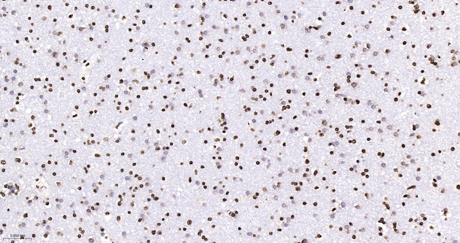 Paraformaldehyde-fixed, paraffin embedded Human Glioma; Antigen retrieval by boiling in sodium citrate buffer (pH6.0) for 15 min; The section was incubated with Histone H3(mono methyl K79) Monoclonal Antibody, Unconjugated (ascites of bsm-33104M) at 1:1500 overnight at 4°C, followed by conjugation to the bs-40296G-HRP and DAB (C-0010) staining.