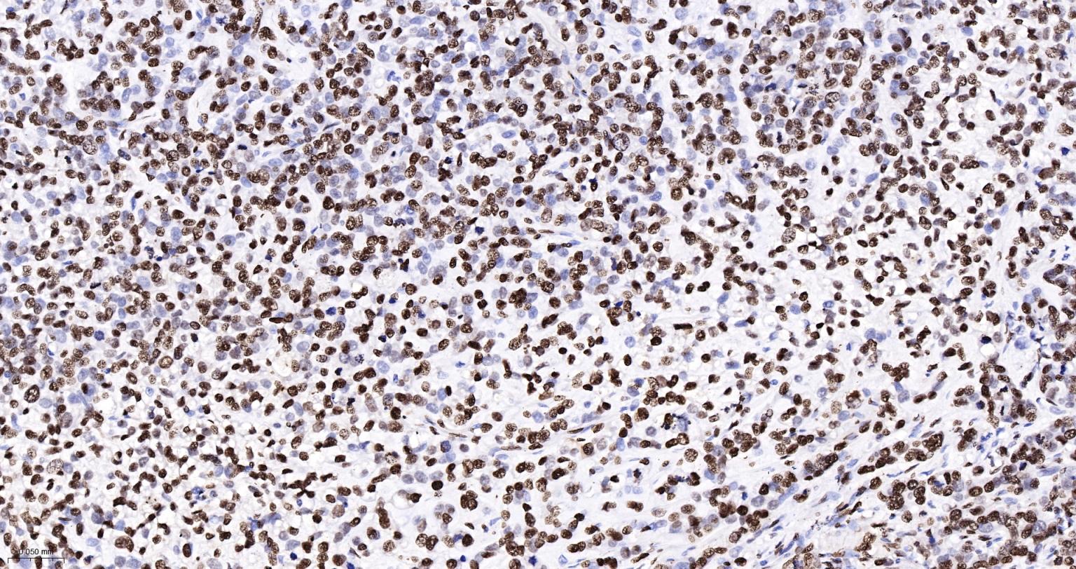 Paraformaldehyde-fixed, paraffin embedded Human Breast Cancer; Antigen retrieval by boiling in sodium citrate buffer (pH6.0) for 15 min; The section was incubated with Histone H3(mono methyl K79) Monoclonal Antibody, Unconjugated (ascites of bsm-33104M) at 1:1500 overnight at 4°C, followed by conjugation to the bs-40296G-HRP and DAB (C-0010) staining.