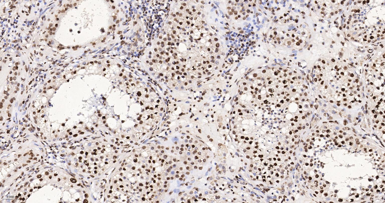Paraformaldehyde-fixed, paraffin embedded Human Testicles; Antigen retrieval by boiling in sodium citrate buffer (pH6.0) for 15 min; The section was incubated with Histone H3(mono methyl K79) Monoclonal Antibody, Unconjugated (ascites of bsm-33104M) at 1:1500 overnight at 4°C, followed by conjugation to the bs-40296G-HRP and DAB (C-0010) staining.
