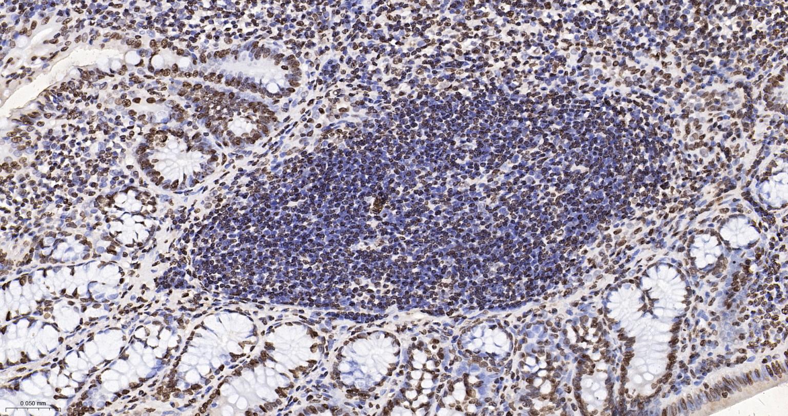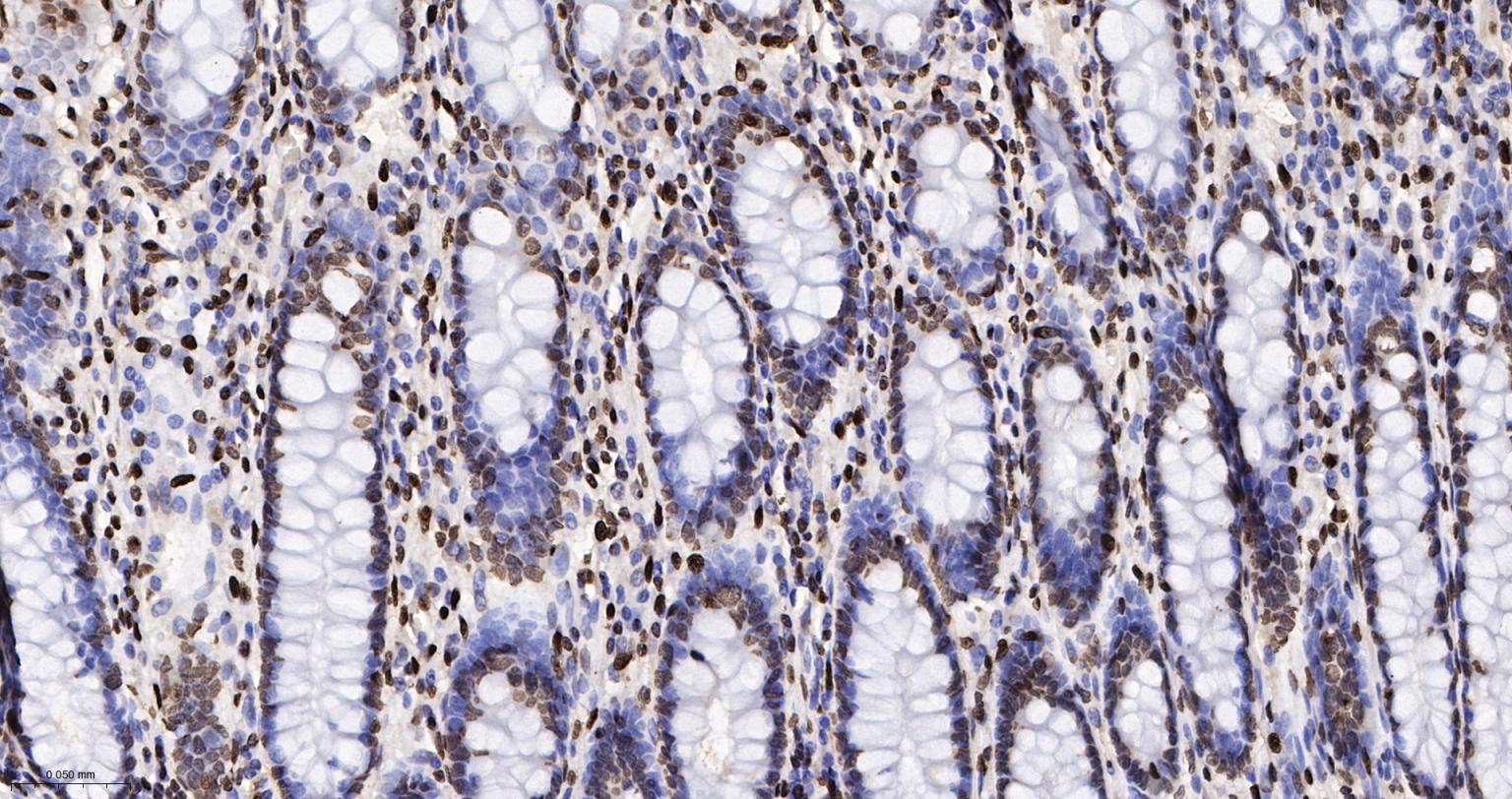 Paraformaldehyde-fixed, paraffin embedded (rat colon); Antigen retrieval by boiling in sodium citrate buffer (pH6.0) for 15min; Block endogenous peroxidase by 3% hydrogen peroxide for 20 minutes; Blocking buffer (normal goat serum) at 37°C for 30min; Antibody incubation with (Histone H3) Monoclonal Antibody, Unconjugated (ascites of bsm-33104M 3D6) at 1:2000 overnight at 4°C, followed by operating according to SP Kit(Mouse) (sp-0024) instructions and DAB staining.