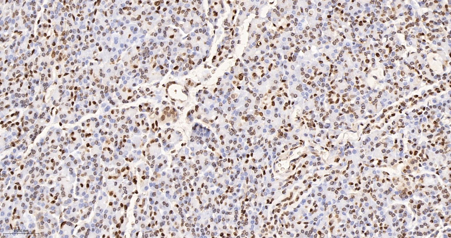Paraformaldehyde-fixed, paraffin embedded (rat pancreas); Antigen retrieval by boiling in sodium citrate buffer (pH6.0) for 15min; Block endogenous peroxidase by 3% hydrogen peroxide for 20 minutes; Blocking buffer (normal goat serum) at 37°C for 30min; Antibody incubation with (Histone H3) Monoclonal Antibody, Unconjugated (ascites of bsm-33104M 3D6) at 1:2000 overnight at 4°C, followed by operating according to SP Kit(Mouse) (sp-0024) instructions and DAB staining.