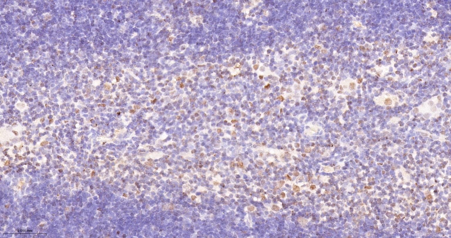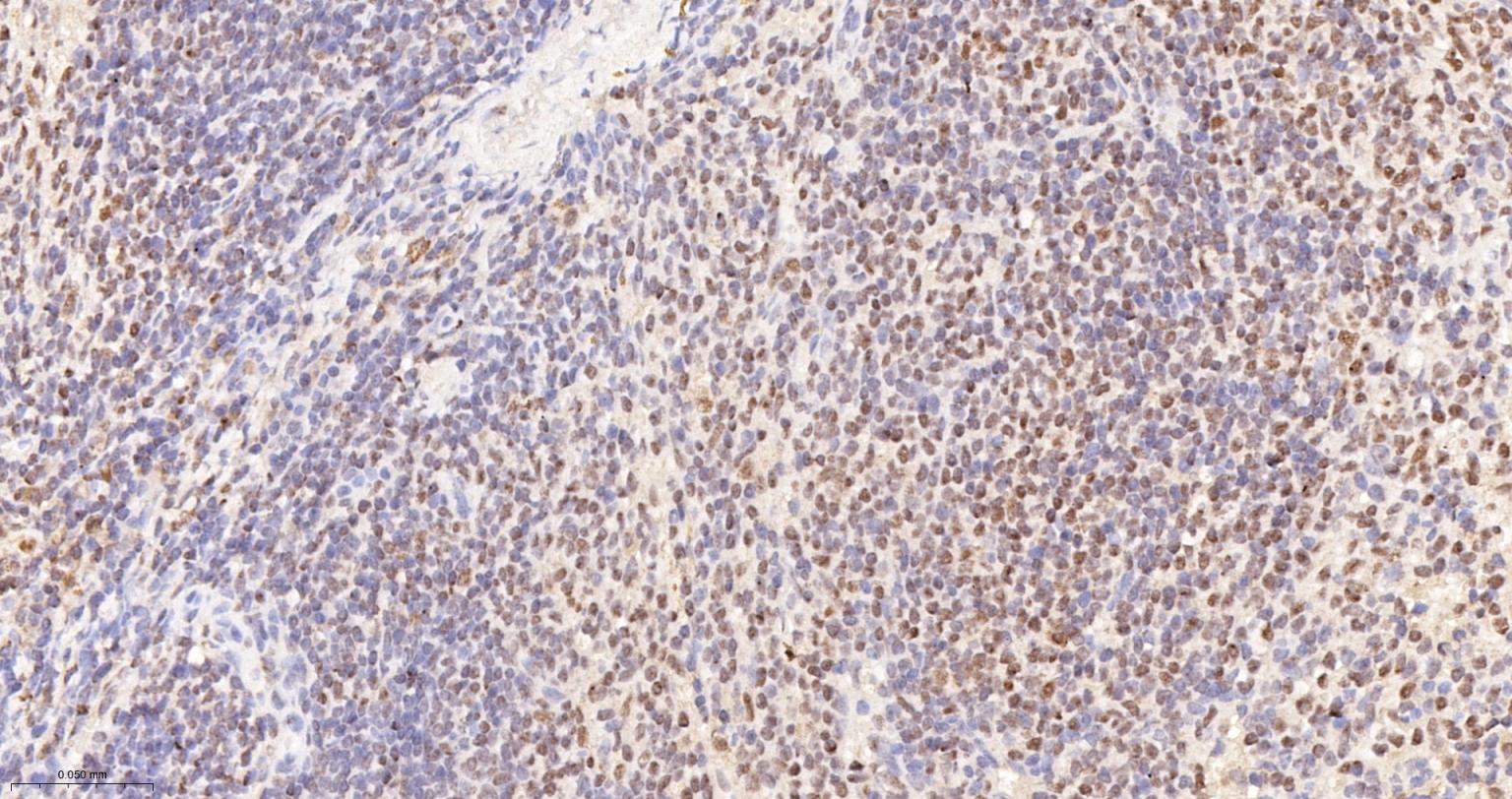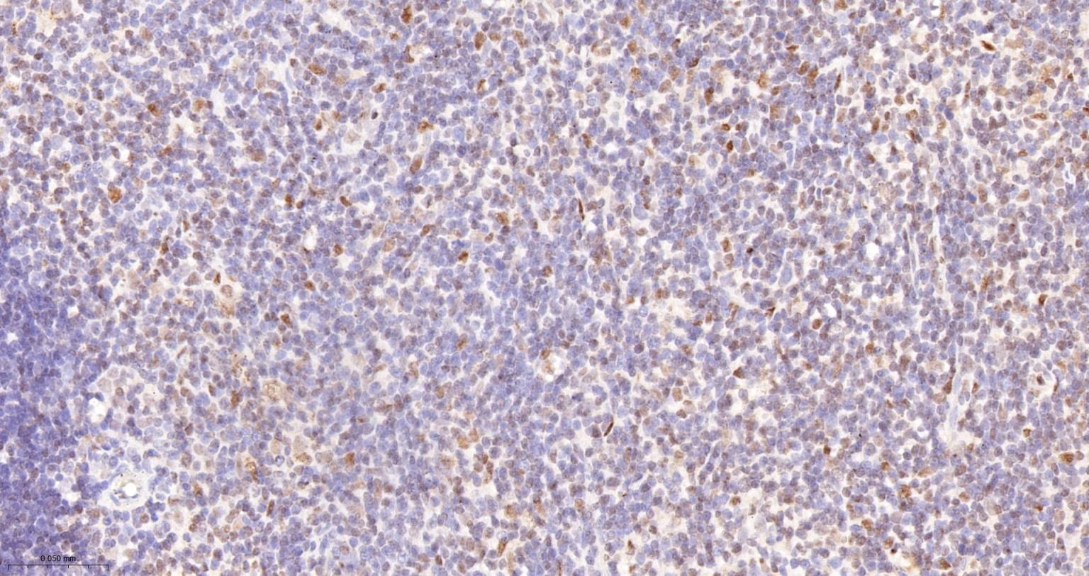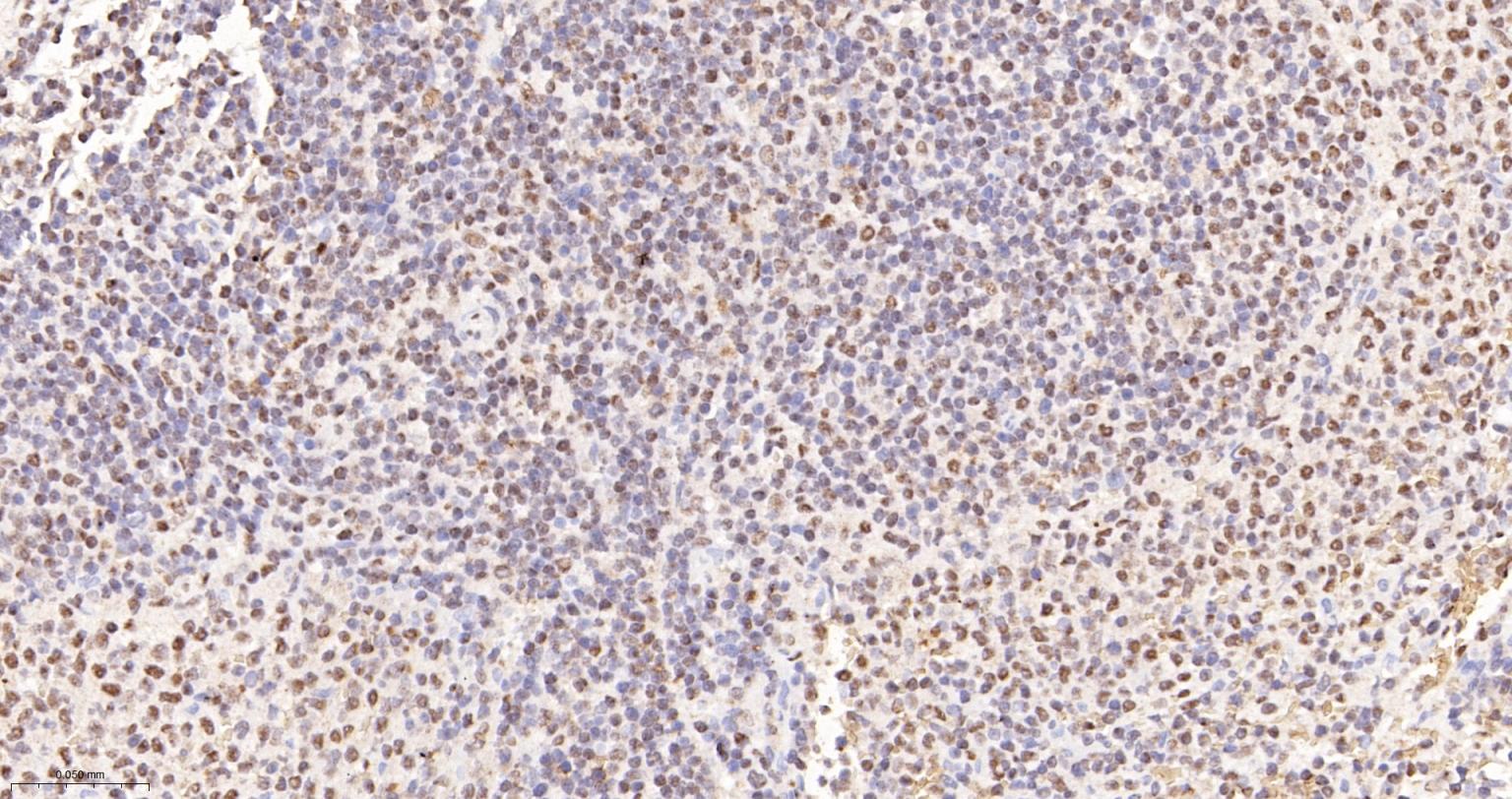 Paraformaldehyde-fixed, paraffin embedded Rat Spleen; Antigen retrieval by boiling in sodium citrate buffer (pH6.0) for 15 min; The section was incubated with HP1 gamma Monoclonal Antibody, Unconjugated (ascites of bsm-33376M) at 1:800 overnight at 4°C, followed by conjugation to the bs-40296G-HRP and DAB (C-0010) staining.