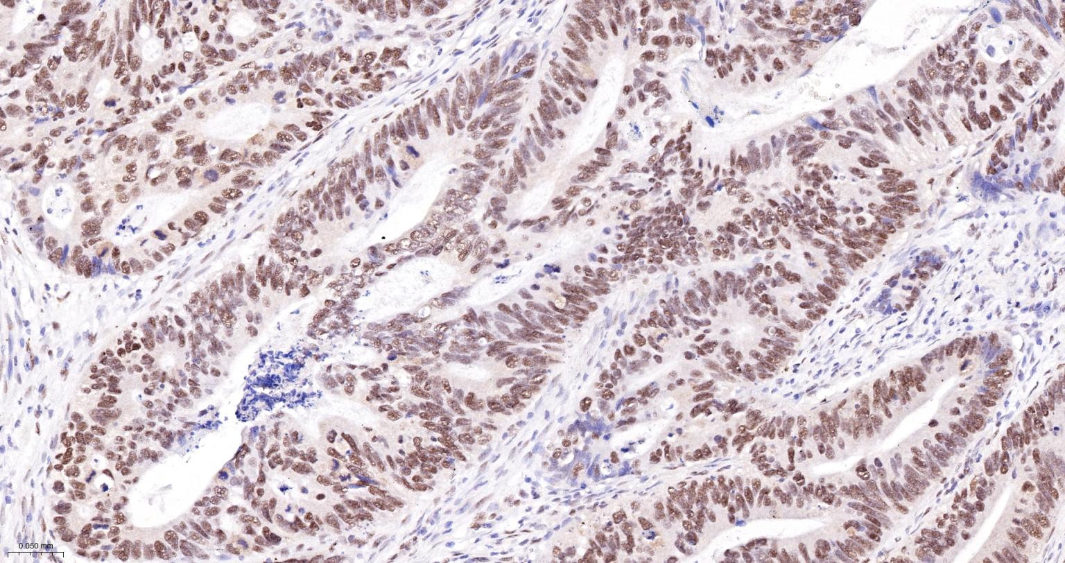 Paraformaldehyde-fixed, paraffin embedded Human Colon Cancer; Antigen retrieval by boiling in sodium citrate buffer (pH6.0) for 15 min; The section was incubated with HP1 gamma Monoclonal Antibody, Unconjugated (ascites of bsm-33376M) at 1:800 overnight at 4°C, followed by conjugation to the bs-40296G-HRP and DAB (C-0010) staining.