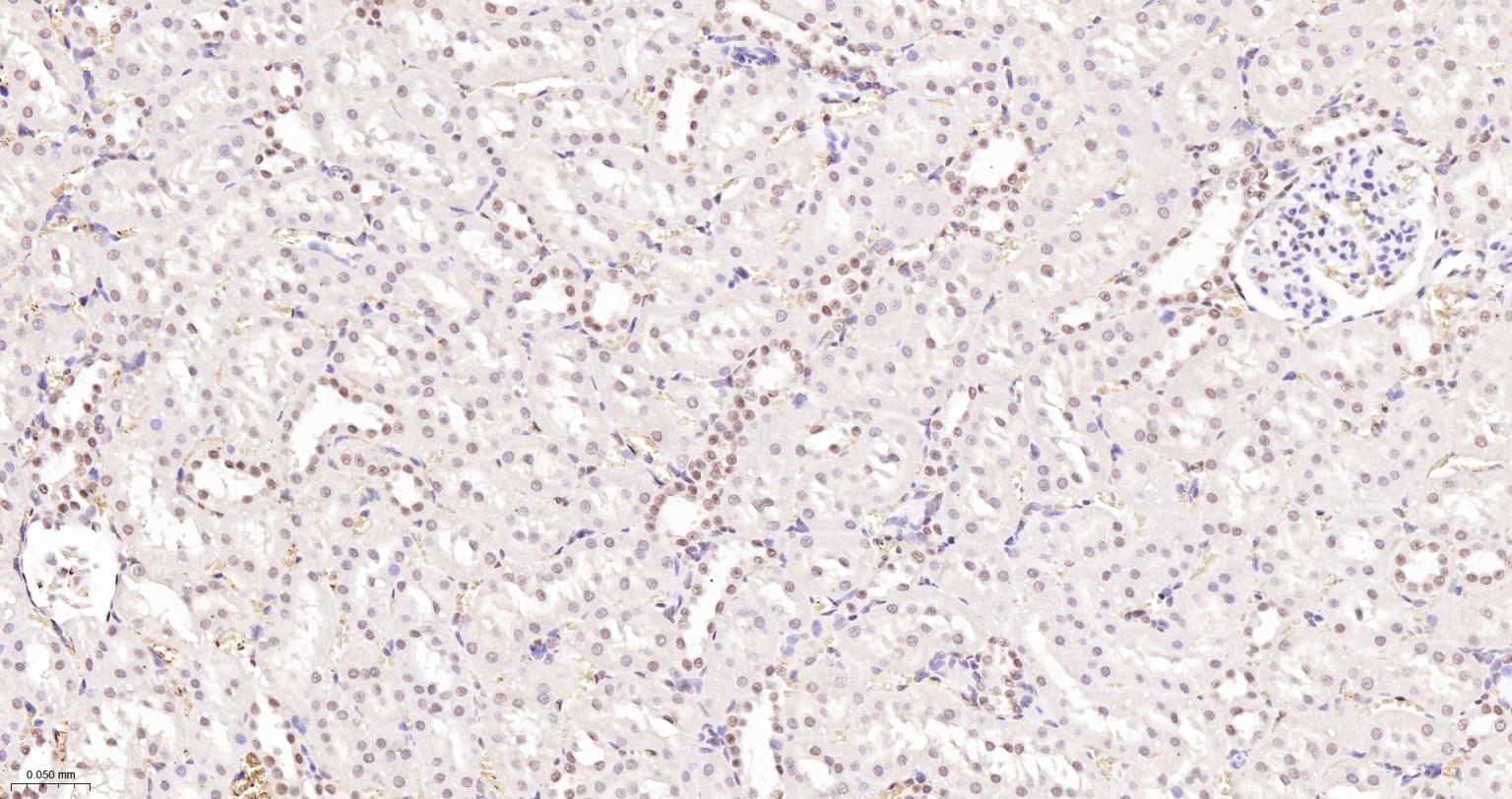 Paraformaldehyde-fixed, paraffin embedded Rat Kidney; Antigen retrieval by boiling in sodium citrate buffer (pH6.0) for 15 min; The section was incubated with HP1 gamma Monoclonal Antibody, Unconjugated (ascites of bsm-33376M) at 1:800 overnight at 4°C, followed by conjugation to the bs-40296G-HRP and DAB (C-0010) staining.