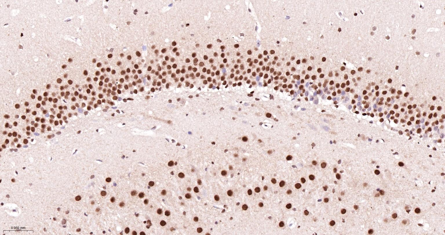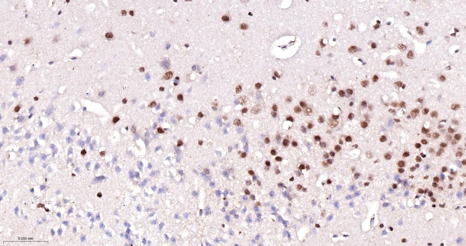 Paraformaldehyde-fixed, paraffin embedded Rat Cerebrum; Antigen retrieval by boiling in sodium citrate buffer (pH6.0) for 15 min; The section was incubated with HP1 gamma Monoclonal Antibody, Unconjugated (ascites of bsm-33376M) at 1:800 overnight at 4°C, followed by conjugation to the bs-40296G-HRP and DAB (C-0010) staining.