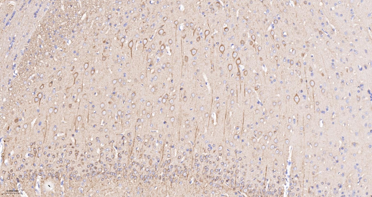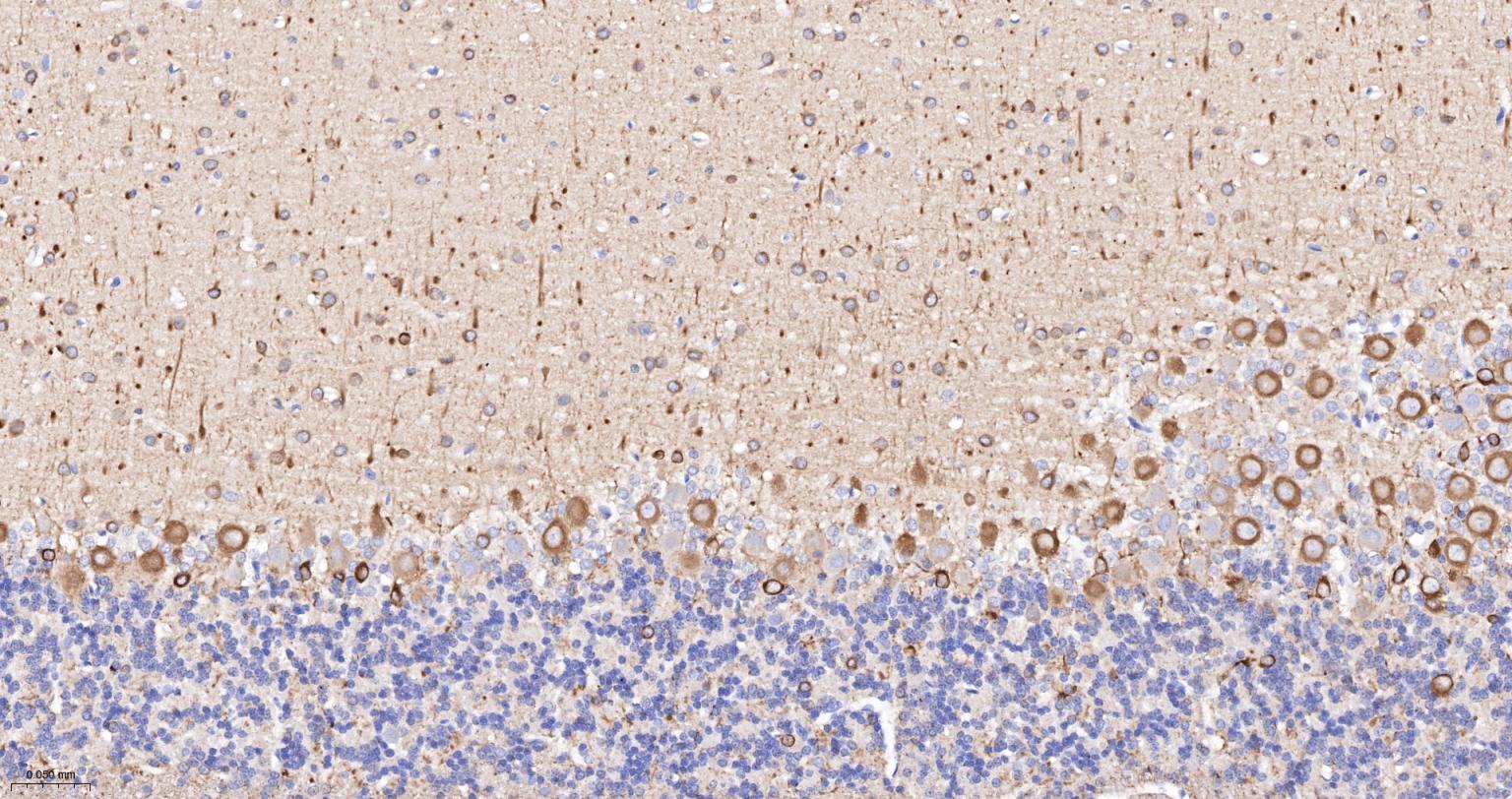 Paraformaldehyde-fixed, paraffin embedded (rat cerebellum); Antigen retrieval by boiling in sodium citrate buffer (pH6.0) for 15min; Block endogenous peroxidase by 3% hydrogen peroxide for 20 minutes; Blocking buffer (normal goat serum) at 37°C for 30min; Incubation with (TUBB3 (Neuronal Marker) ) Monoclonal Antibody, Unconjugated (bsm-33177M) at 1:200 overnight at 4°C, followed by operating according to SP Kit(Mouse)(sp-0024) instructionsand DAB staining.