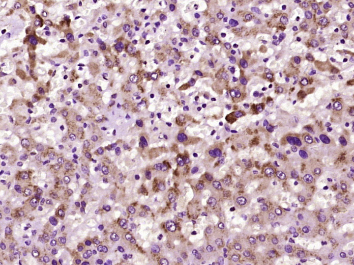Paraformaldehyde-fixed, paraffin embedded (human liver carcinoma); Antigen retrieval by boiling in sodium citrate buffer (pH6.0) for 15min; Block endogenous peroxidase by 3% hydrogen peroxide for 20 minutes; Blocking buffer (normal goat serum) at 37°C for 30min; Antibody incubation with (GST1) Polyclonal Antibody, Unconjugated (bs-0663R) at 1:400 overnight at 4°C, followed by operating according to SP Kit(Rabbit) (sp-0023) instructionsand DAB staining.