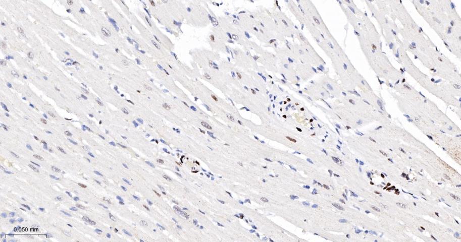 Paraformaldehyde-fixed, paraffin embedded Rat Heart; Antigen retrieval by boiling in sodium citrate buffer (pH6.0) for 15 min; Antibody incubation with phospho-STAT3 (Ser727) Monoclonal Antibody, Unconjugated(bsm-52210R) at 1:200 overnight at 4°C, followed by conjugation to the bs-0295G-HRP and DAB (C-0010) staining.