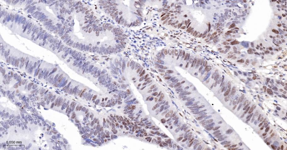 Paraformaldehyde-fixed, paraffin embedded Human Colon Cancer; Antigen retrieval by boiling in sodium citrate buffer (pH6.0) for 15 min; Antibody incubation with phospho-STAT3 (Ser727) Monoclonal Antibody, Unconjugated(bsm-52210R) at 1:200 overnight at 4°C, followed by conjugation to the bs-0295G-HRP and DAB (C-0010) staining.