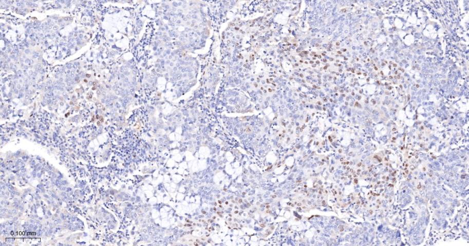 Paraformaldehyde-fixed, paraffin embedded Human Cervical Cancer; Antigen retrieval by boiling in sodium citrate buffer (pH6.0) for 15 min; Antibody incubation with phospho-STAT3 (Ser727) Monoclonal Antibody, Unconjugated(bsm-52210R) at 1:200 overnight at 4°C, followed by conjugation to the bs-0295G-HRP and DAB (C-0010) staining.