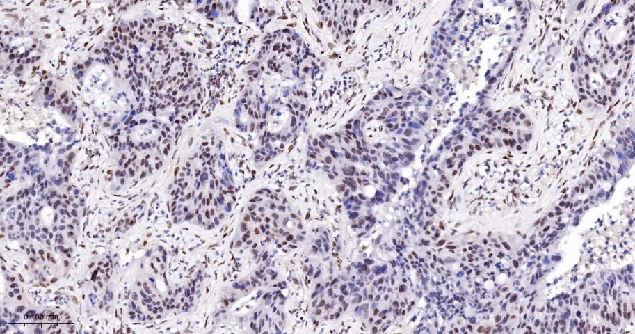 Paraformaldehyde-fixed, paraffin embedded Human Lung Cancer; Antigen retrieval by boiling in sodium citrate buffer (pH6.0) for 15 min; The section was incubated with phospho-STAT3 (Ser727) Monoclonal Antibody, Unconjugated (bsm-52210R) at 1:200 overnight at 4°C, followed by conjugation to the bs-0295G-HRP and DAB (C-0010) staining.