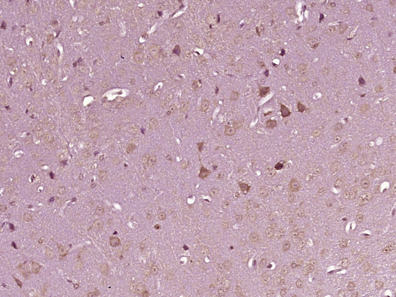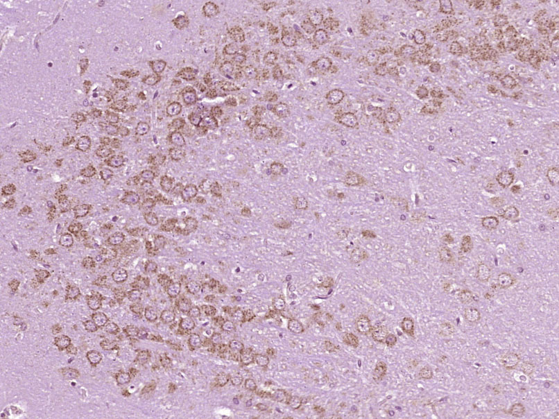 Paraformaldehyde-fixed, paraffin embedded (Rat brain); Antigen retrieval by boiling in sodium citrate buffer (pH6.0) for 15min; Block endogenous peroxidase by 3% hydrogen peroxide for 20 minutes; Blocking buffer (normal goat serum) at 37°C for 30min; Antibody incubation with (Caspase-6 subunit p11) Polyclonal Antibody, Unconjugated (bs-23596R) at 1:400 overnight at 4°C, followed by operating according to SP Kit(Rabbit) (sp-0023) instructionsand DAB staining.
