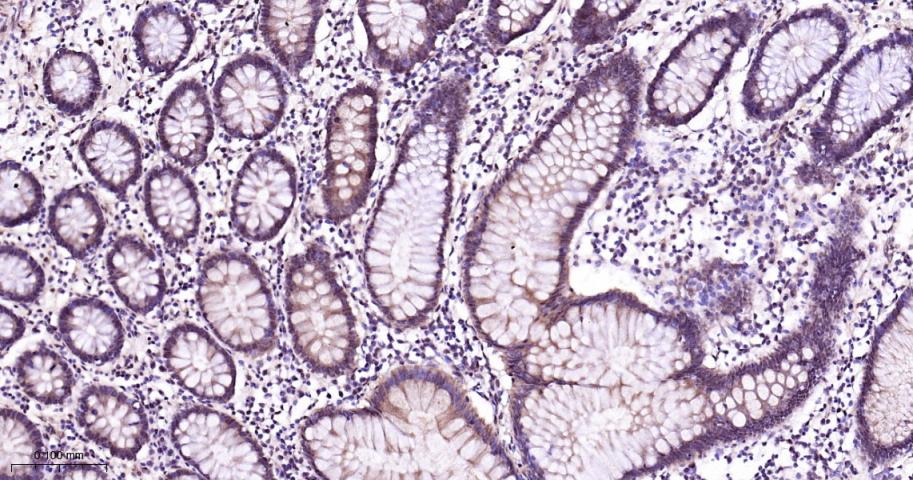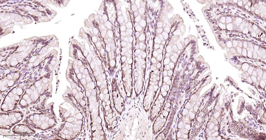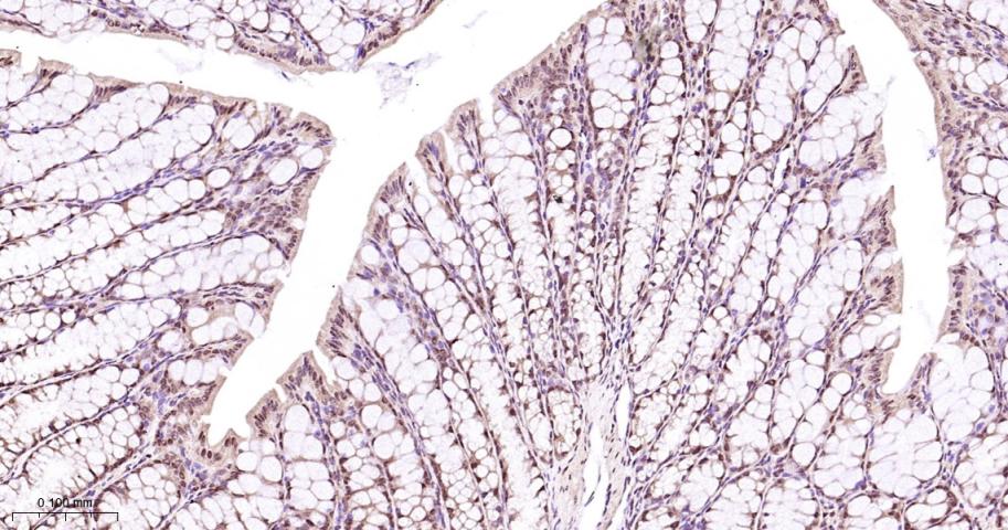 Paraformaldehyde-fixed, paraffin embedded Mouse Colon; Antigen retrieval by boiling in sodium citrate buffer (pH6.0) for 15 min; Antibody incubation with P38 MAPK/ MAPK14 Polyclonal Antibody, Unconjugated (bs-28027R) at 1:200 overnight at 4°C, followed by conjugation to the bs-0295G-HRP and DAB (C-0010) staining.