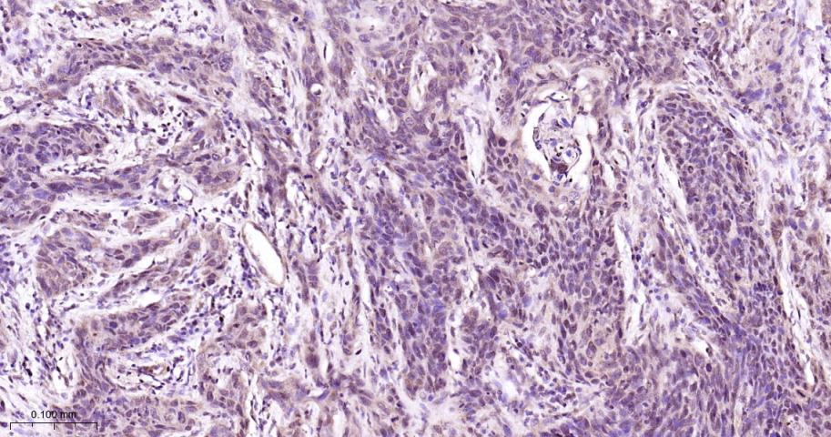 Paraformaldehyde-fixed, paraffin embedded Human Cervical Cancer; Antigen retrieval by boiling in sodium citrate buffer (pH6.0) for 15 min; Antibody incubation with P38 MAPK/ MAPK14 Polyclonal Antibody, Unconjugated (bs-28027R) at 1:200 overnight at 4°C, followed by conjugation to the bs-0295G-HRP and DAB (C-0010) staining.