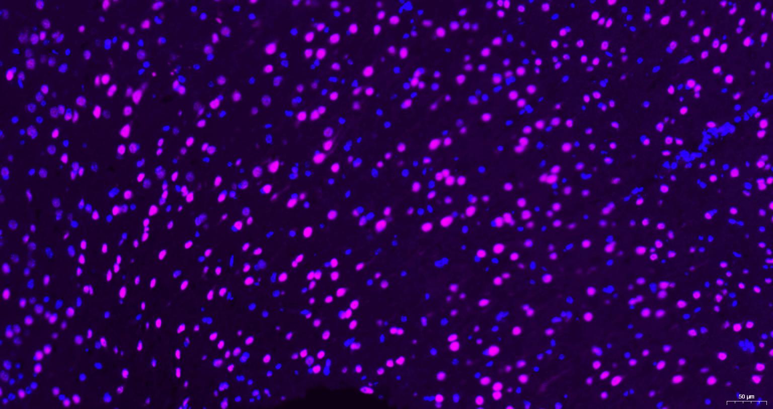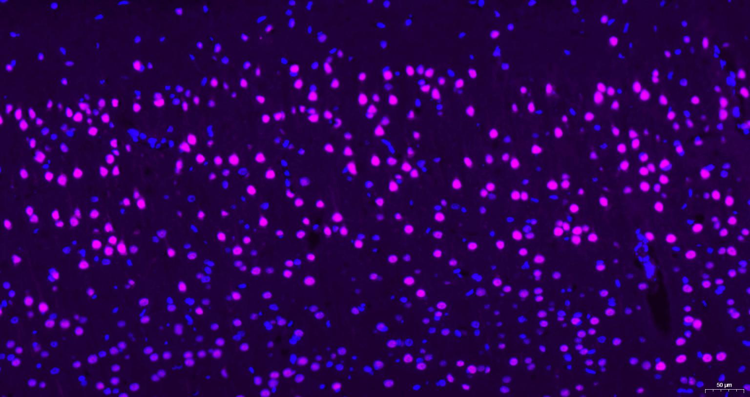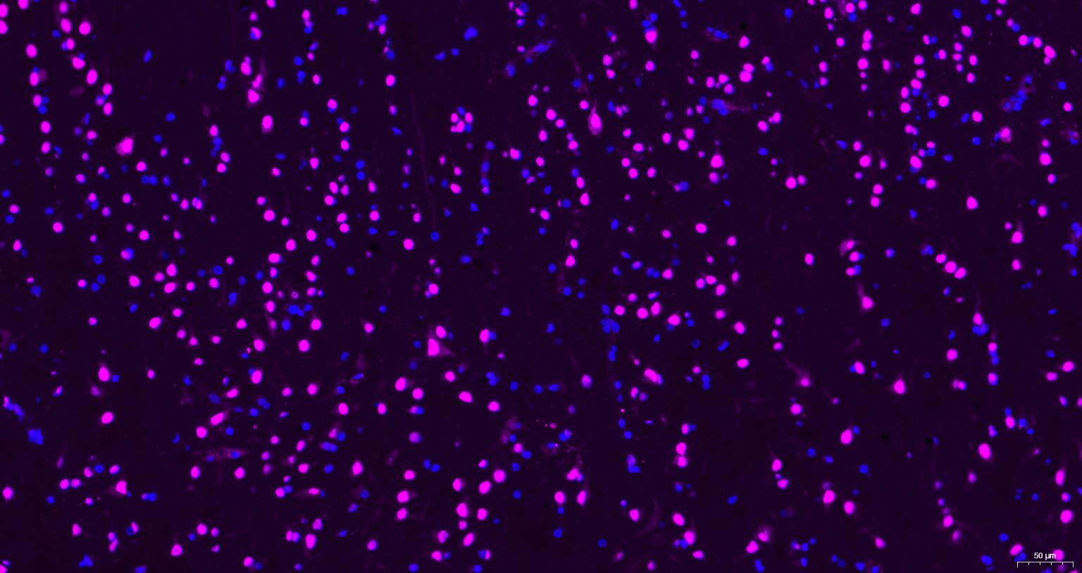 Paraformaldehyde-fixed, paraffin embedded Rat brain; Antigen retrieval by boiling in sodium citrate buffer (pH6.0) for 15 min; Antibody incubation with AKT1 Monoclonal Antibody, Unconjugated(bsm-52010R) at 1:200 overnight at 4°C, followed by a Cy5 conjugated Goat Anti-Rabbit IgG (bs-0295G-Cy5)antibody at 37°C for 90 minutes, DAPI (blue, C02-04002) was used to stain the cell nuclei.