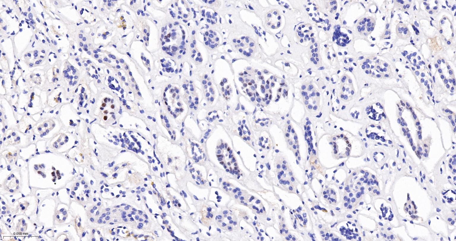 Paraformaldehyde-fixed, paraffin embedded Human Kidney; Antigen retrieval by boiling in sodium citrate buffer (pH6.0) for 15 min; The section was incubated with phospho-GATA3 (Ser308) Monoclonal Antibody, Unconjugated (bsm-52157R) at 1:200 overnight at 4°C, followed by conjugation to the bs-0295G-HRP and DAB (C-0010) staining.
