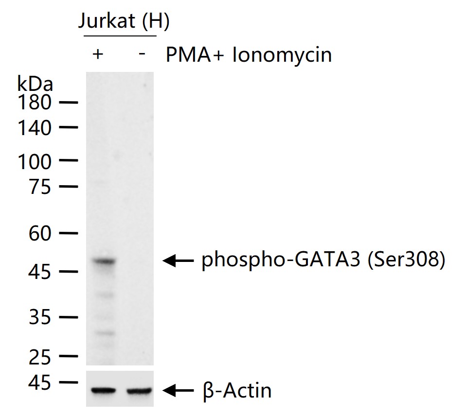 Jurkat (H) cells were treated with or without PMA (50 ng/mL)+ Ionomycin(1 μM) for 2 h, 25 μg total protein per lane of cell lysates (see on figure) probed with phospho-GATA3 (Ser308) monoclonal antibody, unconjugated (bsm-52157R) at 1:1000 dilution and 4°C overnight incubation. Followed by conjugated secondary antibody incubation at r.t. for 60 min.