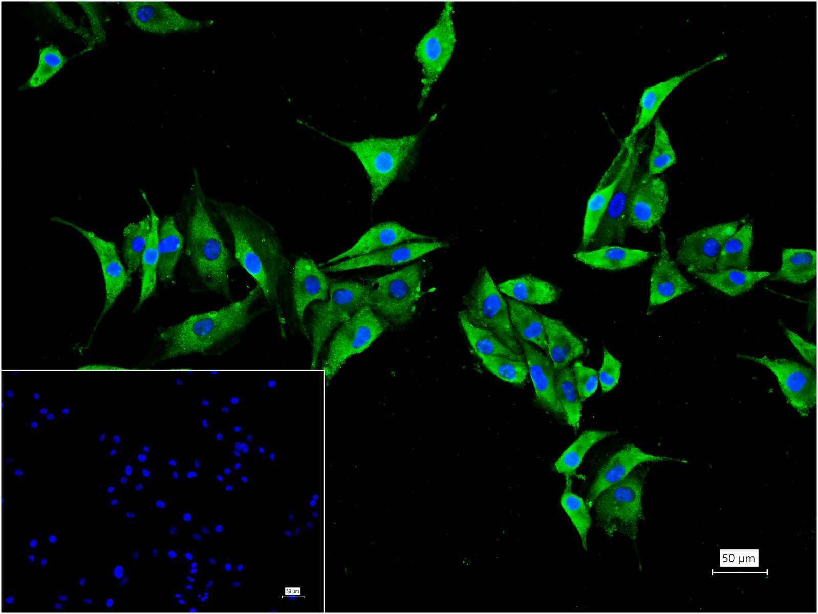 4% Paraformaldehyde-fixed SK-MEL-28 (H) cell; Triton X-100 at r.t. for 20 min; Antibody incubation with (BCL2A1) monoclonal Antibody, unconjugated (bsm-52023R) 1:100, 90 min at 37°C; followed by BF488 conjugated Goat Anti-Rabbit IgG antibody (green, bs-60295G-BF488) at 37°C for 90 min, DAPI (blue, C02-04002) was used to stain the cell nuclei. PBS instead of the primary antibody was used as the blank control.