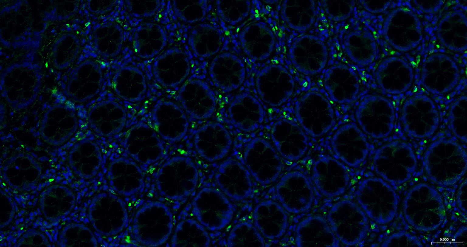 Paraformaldehyde-fixed, paraffin embedded Human Colon; Antigen retrieval by boiling in sodium citrate buffer (pH6.0) for 15 min; The section was incubated with c-Kit Antibody, Unconjugated (bsm-52036R) at 1:200 overnight at 4°C. Followed by conjugated Goat Anti-Rabbit IgG antibody (Green, bs-0295G-BF488), DAPI (blue, C02-04002) was used to stain the cell nuclei.