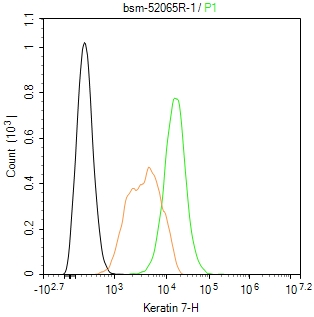 The Hela (H) cells were fixed with 4% PFA (10 min at r.t.) and then permeabilized with 90% ice-cold methanol for 20 min at -20℃,the cells then were incubated in 5%BSA to block non-specific protein-protein interactions (30 min at r.t.), followed by secondary antibody incubation for 40 min at room temperature. Primary Antibody (green):Rabbit Anti-Keratin 7 antibody (bsm-52065R,1:100); Isotype Control (orange): Rabbit IgG (bs-0295P). Blank control (black): PBS. Acquisition of 20,000 events was performed.