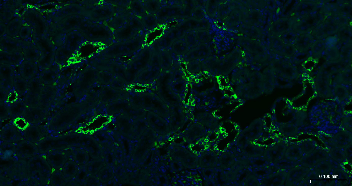 Paraformaldehyde-fixed, paraffin embedded Mouse Kidney; Antigen retrieval by boiling in sodium citrate buffer (pH6.0) for 15 min; The section was incubated with CK7 Monoclonal Antibody, Unconjugated (bsm-52065R) at 1:200 overnight at 4°C. Followed by conjugated Goat Anti-Rabbit IgG antibody (green, bs-0295G-BF488), DAPI (blue, C02-04002) was used to stain the cell nuclei.