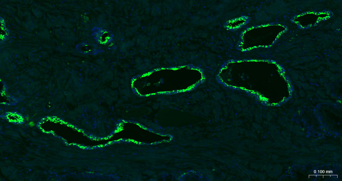Paraformaldehyde-fixed, paraffin embedded Human Prostate; Antigen retrieval by boiling in sodium citrate buffer (pH6.0) for 15 min; The section was incubated with CK7 Monoclonal Antibody, Unconjugated (bsm-52065R) at 1:200 overnight at 4°C. Followed by conjugated Goat Anti-Rabbit IgG antibody (green, bs-0295G-BF488), DAPI (blue, C02-04002) was used to stain the cell nuclei.