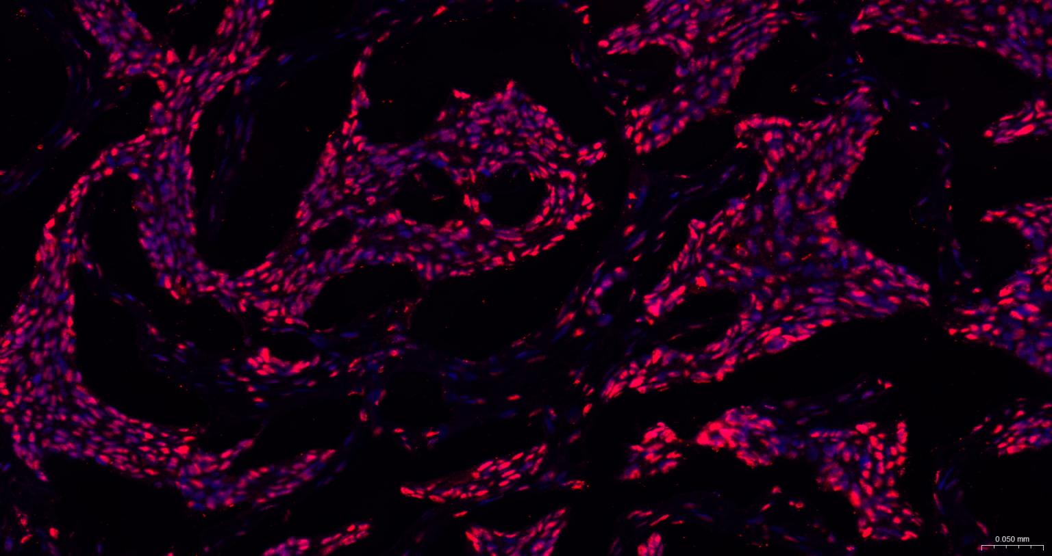 Paraformaldehyde-fixed, paraffin embedded Human Breast Cancer; Antigen retrieval by boiling in sodium citrate buffer (pH6.0) for 15 min; The section was incubated with HDAC2 Monoclonal Antibody, Unconjugated (bsm-52082R) at 1:200 overnight at 4°C. Followed by conjugated Goat Anti-Rabbit IgG antibody (Red, bs-0295G-BF594), DAPI (blue, C02-04002) was used to stain the cell nuclei.