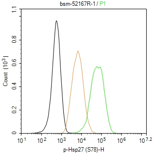 The Hela ( treated with 200J/m2 UV-C then recovery for 30 min) (H) cells were fixed with 4% PFA (10 min at r.t.) and then permeabilized with 90% ice-cold methanol for 20 min at -20℃,the cells then were incubated in 5%BSA to block non-specific protein-protein interactions (30 min at r.t.), followed by secondary antibody incubation for 40 min at room temperature.Primary Antibody (green):Rabbit Anti-p-Hsp27 (S78) antibody (bsm-52167R,1:100); Isotype Control (orange): Rabbit IgG (bs-0295P). Blank control (black): PBS. Acquisition of 20,000 events was performed.