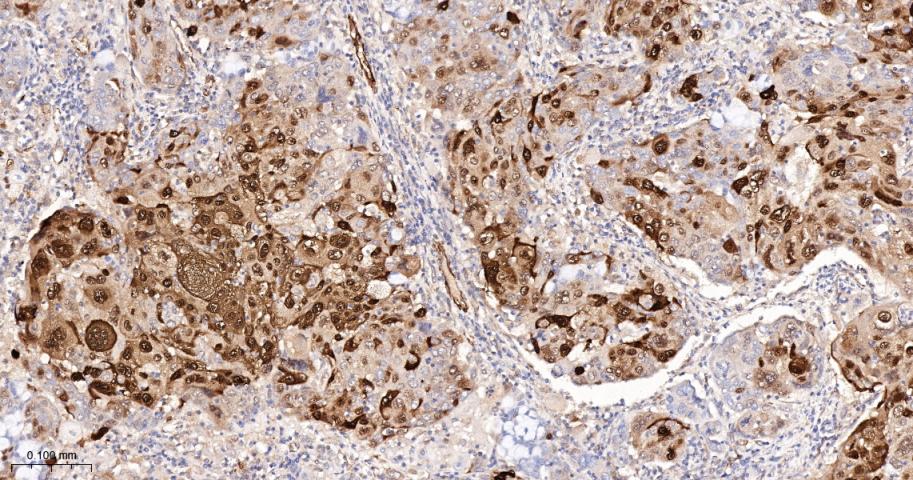 Paraformaldehyde-fixed, paraffin embedded Human Cervical Cancer; Antigen retrieval by boiling in sodium citrate buffer (pH6.0) for 15 min; The section was incubated with phospho-HSP27 (Ser78) Monoclonal Antibody, Unconjugated (bsm-52167R) at 1:200 overnight at 4°C, followed by conjugation to the bs-0295G-HRP and DAB (C-0010) staining.