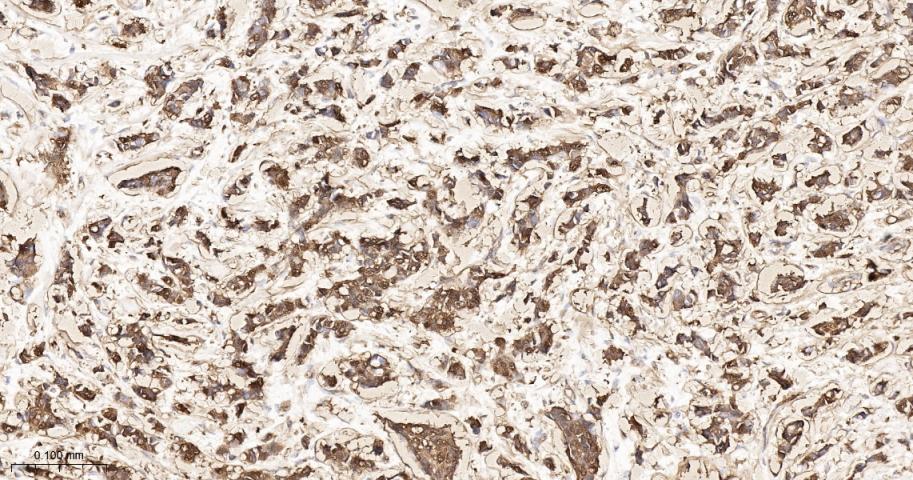 Paraformaldehyde-fixed, paraffin embedded Human Breast Cancer; Antigen retrieval by boiling in sodium citrate buffer (pH6.0) for 15 min; The section was incubated with phospho-HSP27 (Ser78) Monoclonal Antibody, Unconjugated (bsm-52167R) at 1:200 overnight at 4°C, followed by conjugation to the bs-0295G-HRP and DAB (C-0010) staining.