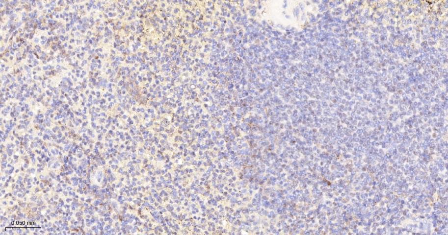 Paraformaldehyde-fixed, paraffin embedded Human Spleen; Antigen retrieval by boiling in sodium citrate buffer (pH6.0) for 15 min; The section was incubated with Phospho-PKC alpha (Thr638) Monoclonal Antibody, Unconjugated (bsm-52187R) at 1:200 overnight at 4°C, followed by conjugation to the bs-0295G-HRP and DAB (C-0010) staining.