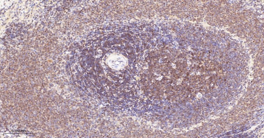 Paraformaldehyde-fixed, paraffin embedded Mouse Spleen; Antigen retrieval by boiling in sodium citrate buffer (pH6.0) for 15 min; The section was incubated with Phospho-PKC alpha (Thr638) Monoclonal Antibody, Unconjugated (bsm-52187R) at 1:200 overnight at 4°C, followed by conjugation to the bs-0295G-HRP and DAB (C-0010) staining.