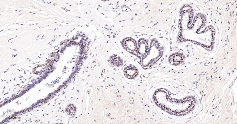 Paraformaldehyde-fixed, paraffin embedded Human Breast Cancer; Antigen retrieval by boiling in sodium citrate buffer (pH6.0) for 15 min; The section was incubated with Phospho-PKC alpha (Thr638) Monoclonal Antibody, Unconjugated (bsm-52187R) at 1:200 overnight at 4°C, followed by conjugation to the bs-0295G-HRP and DAB (C-0010) staining.