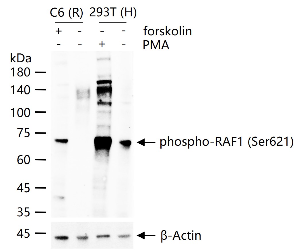 C6 (R) cells were treated with or without forskolin (30uM) for 20 min, 293T (H) cells were treated with or without PMA (100nM) for 1 h, 25 μg total protein per lane of cell lysates (see on figure) probed with phospho-RAF1 (Ser621) monoclonal antibody, unconjugated (bsm-52196R) at 1:1000 dilution and 4°C overnight incubation. Followed by conjugated secondary antibody incubation at r.t. for 60 min.