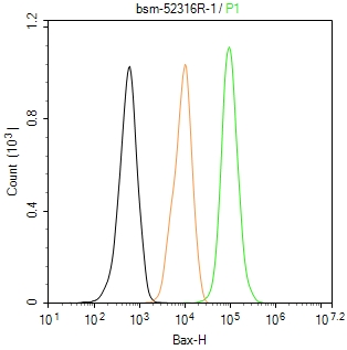 The Hela (H) cells were fixed with 4% PFA (10 min at r.t.) and then permeabilized with 90% ice-cold methanol for 20 min at -20℃,the cells then were incubated in 5%BSA to block non-specific protein-protein interactions (30 min at r.t.), followed by secondary antibody incubation for 40 min at room temperature. Primary Antibody (green):Rabbit Anti-Bax antibody (bsm-52316R,1:100); Isotype Control (orange): Rabbit IgG (bs-0295P). Blank control (black): PBS. Acquisition of 20,000 events was performed.