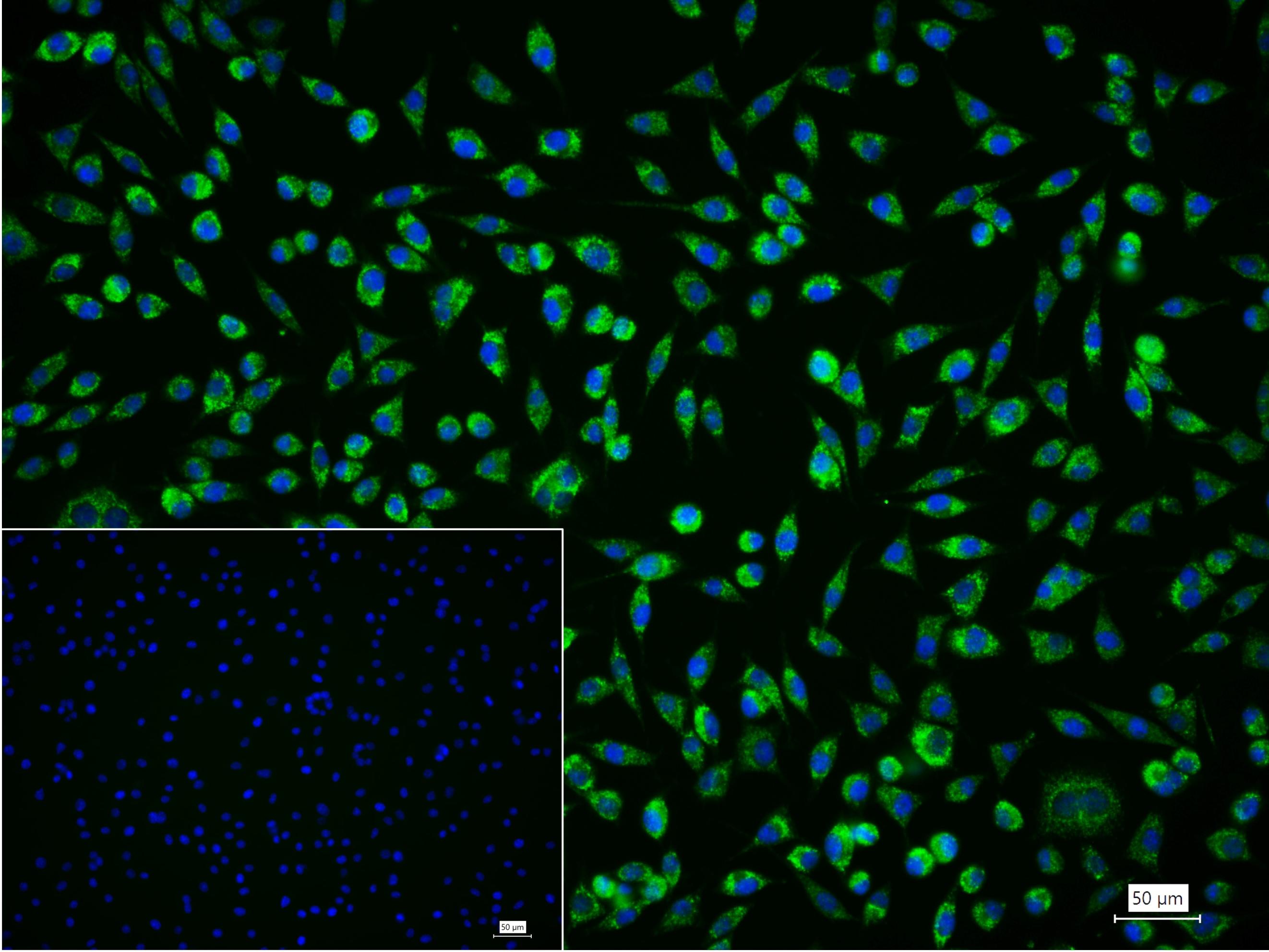 4% Paraformaldehyde-fixed SH-SY5Y (H) cell; Triton X-100 at r.t. for 20 min; Antibody incubation with (Bax) monoclonal Antibody, unconjugated (bsm-52316R) 1:100, 90 min at 37°C; followed by BF488 conjugated Goat Anti-Rabbit IgG antibody (green, bs-60295G-BF488) at 37°C for 90 min, DAPI (blue, C02-04002) was used to stain the cell nuclei. PBS instead of the primary antibody was used as the blank control.