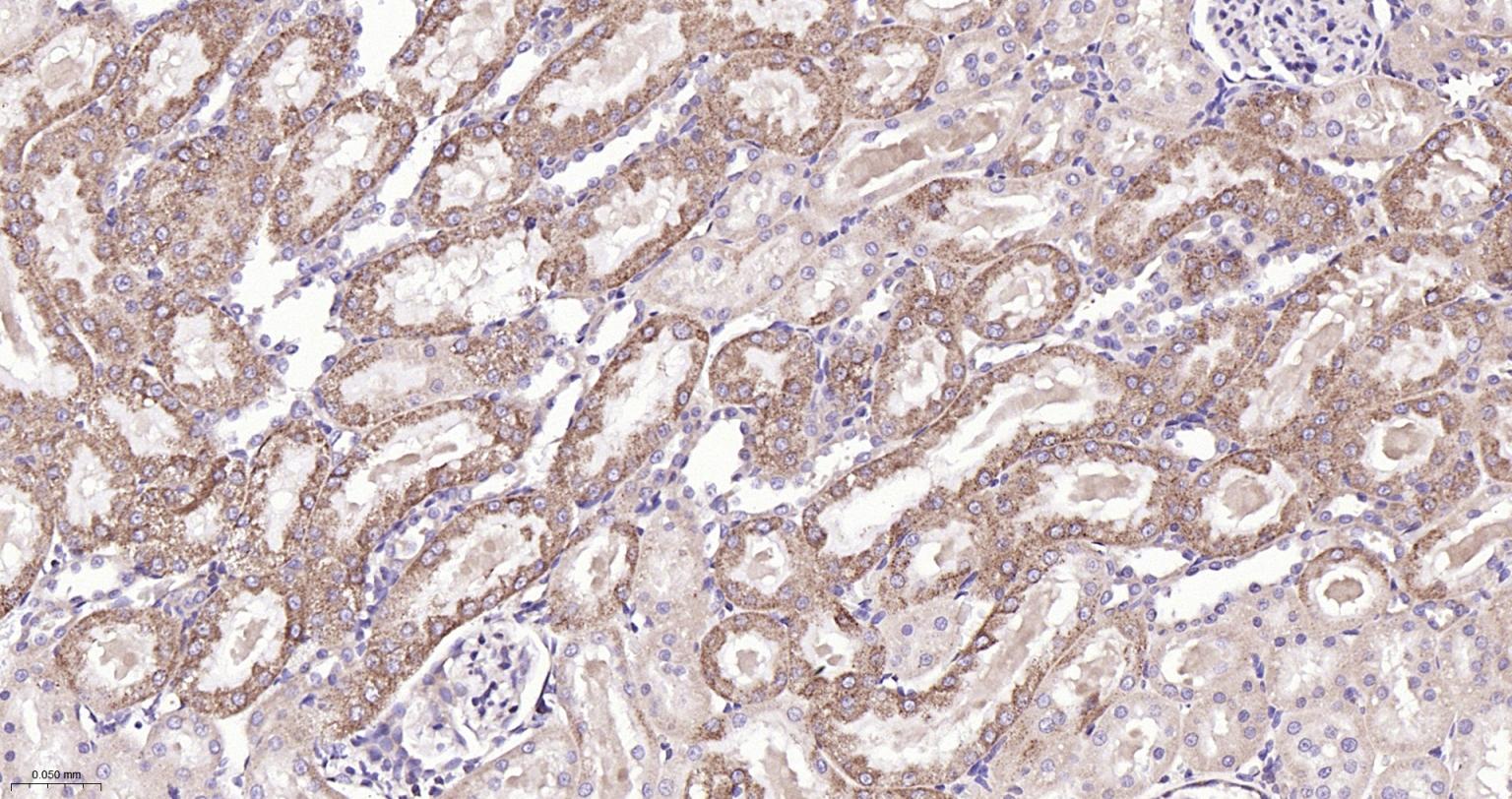 Paraformaldehyde-fixed, paraffin embedded Mouse Kidney; Antigen retrieval by boiling in sodium citrate buffer (pH6.0) for 15 min; Antibody incubation with Bax Monoclonal Antibody, Unconjugated(bsm-52316R) at 1:300 overnight at 4°C, followed by conjugation to the SP Kit (Rabbit, SP-0023)and DAB (C-0010) staining.