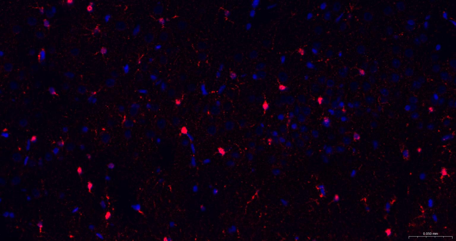 Paraformaldehyde-fixed, paraffin embedded Mouse Cerebrum; Antigen retrieval by boiling in sodium citrate buffer (pH6.0) for 15 min; The section was incubated with S100A1 Polyclonal Antibody, Unconjugated (bs-41209R) at 1:200 overnight at 4°C. Followed by conjugated Goat Anti-Rabbit IgG antibody (Red, bs-0295G-BF594), DAPI (blue, C02-04002) was used to stain the cell nuclei.