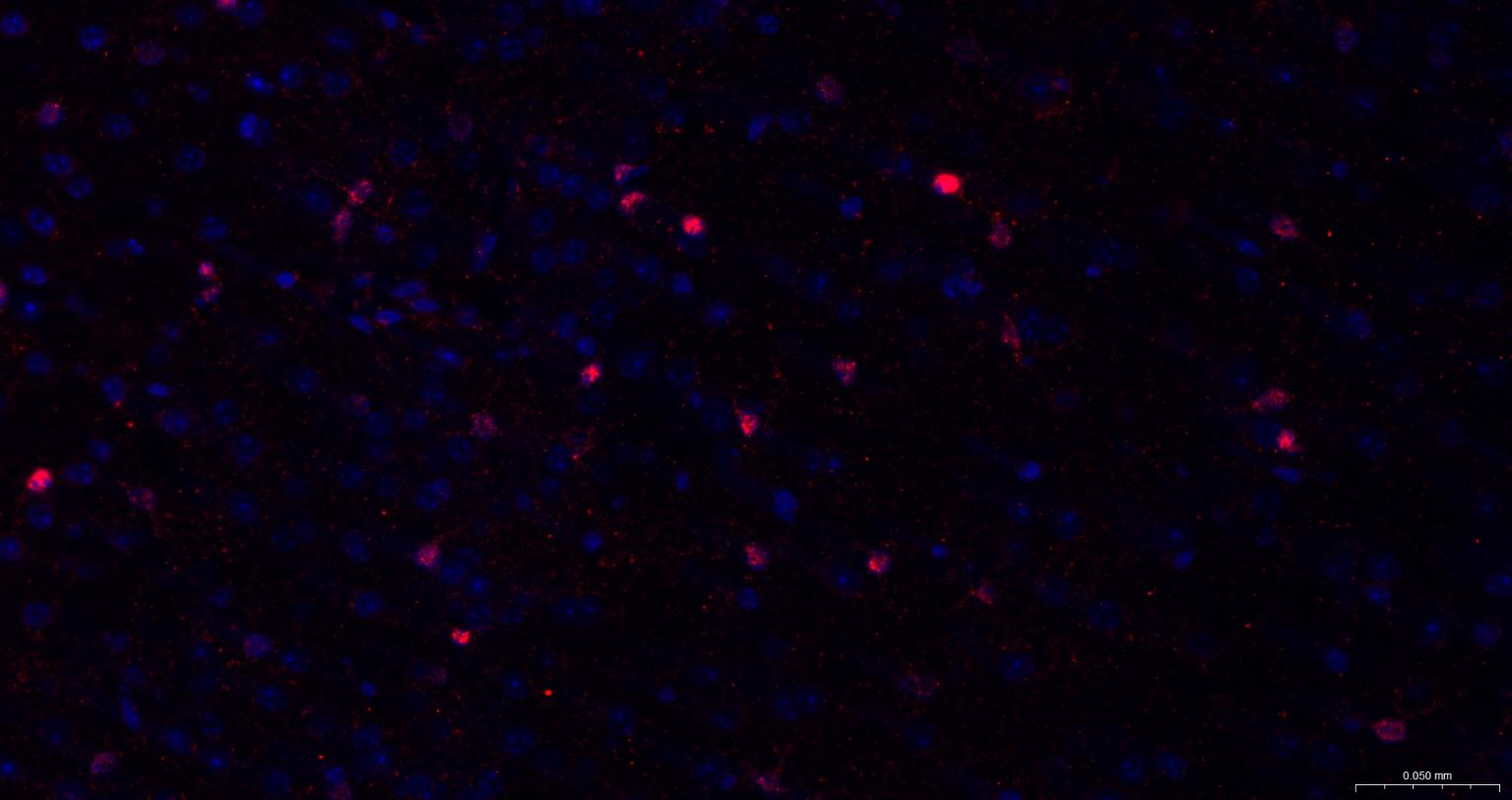 Paraformaldehyde-fixed, paraffin embedded Rat Cerebrum; Antigen retrieval by boiling in sodium citrate buffer (pH6.0) for 15 min; The section was incubated with S100A1 Polyclonal Antibody, Unconjugated (bs-41209R) at 1:200 overnight at 4°C. Followed by conjugated Goat Anti-Rabbit IgG antibody (Red, bs-0295G-BF594), DAPI (blue, C02-04002) was used to stain the cell nuclei.