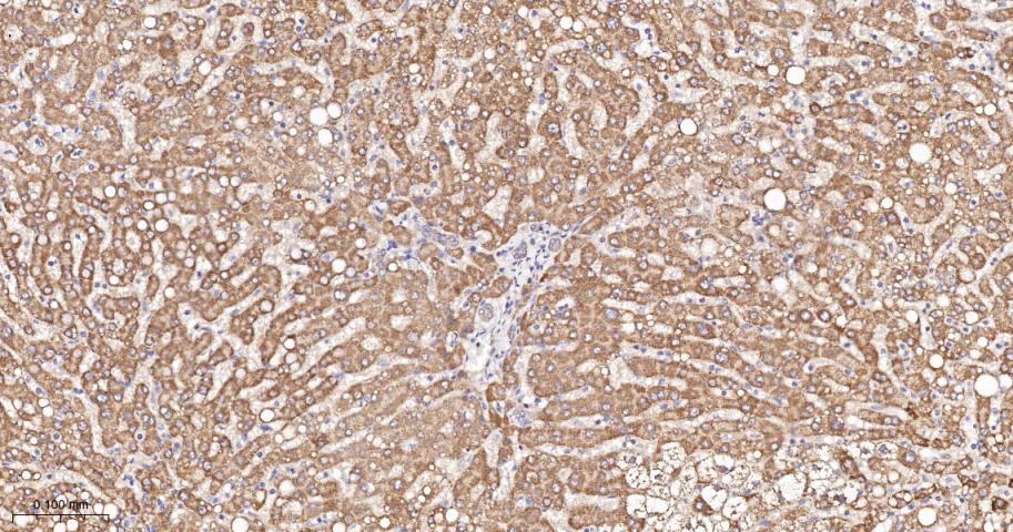 Paraformaldehyde-fixed, paraffin embedded Human Liver; Antigen retrieval by boiling in sodium citrate buffer (pH6.0) for 15 min; The section was incubated with IKK gamma Monoclonal Antibody, Unconjugated (bsm-54012R) at 1:200 overnight at 4°C, followed by conjugation to the bs-0295G-HRP and DAB (C-0010) staining.